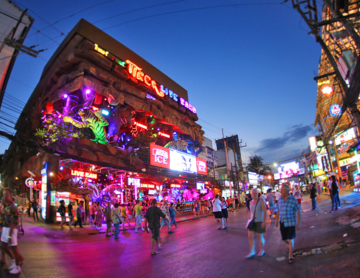 Обгорелые туристы из Восточное Европы в своих поддельных футболках от Armani, туристические группы, бегающие со своими мобильными телефонами и камерами, и мужчины из стран Запада, пытающиеся преодолеть кризис среднего возраста с красивой молодой тайкой, услуги которой оплачены на несколько дней, создают атмосферу абсурдной комедии.